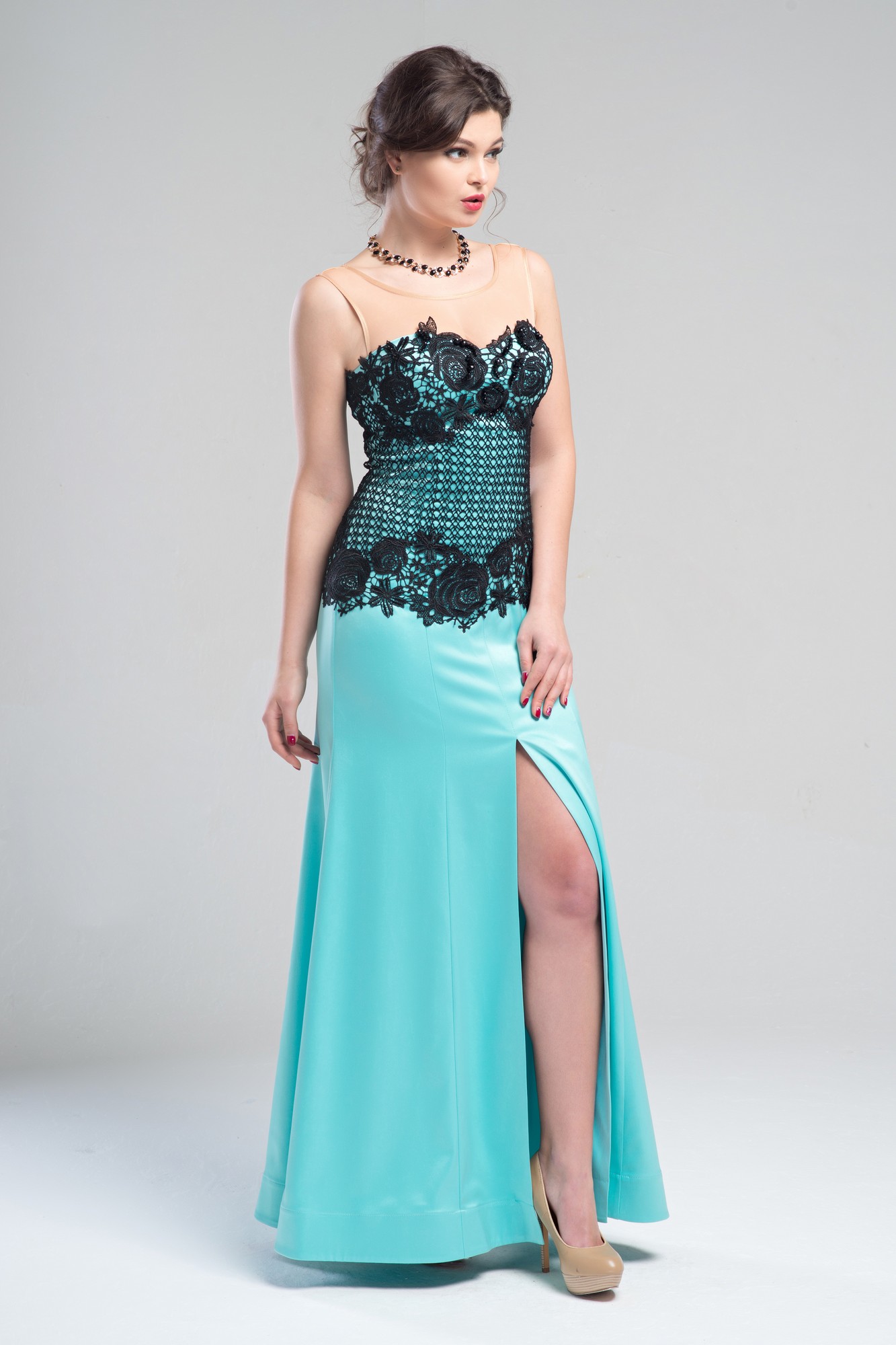 Платье вечернее корсетного типа из однотонного атласа итальянского производства, накрытого в области талии крупной черной сеткой, длинное в пол, прилегающего силуэта с годеобразным расширением к низу, отрезное по линии бедер, с застежкой на потайную тесьму «молния» в левом боковом шве.