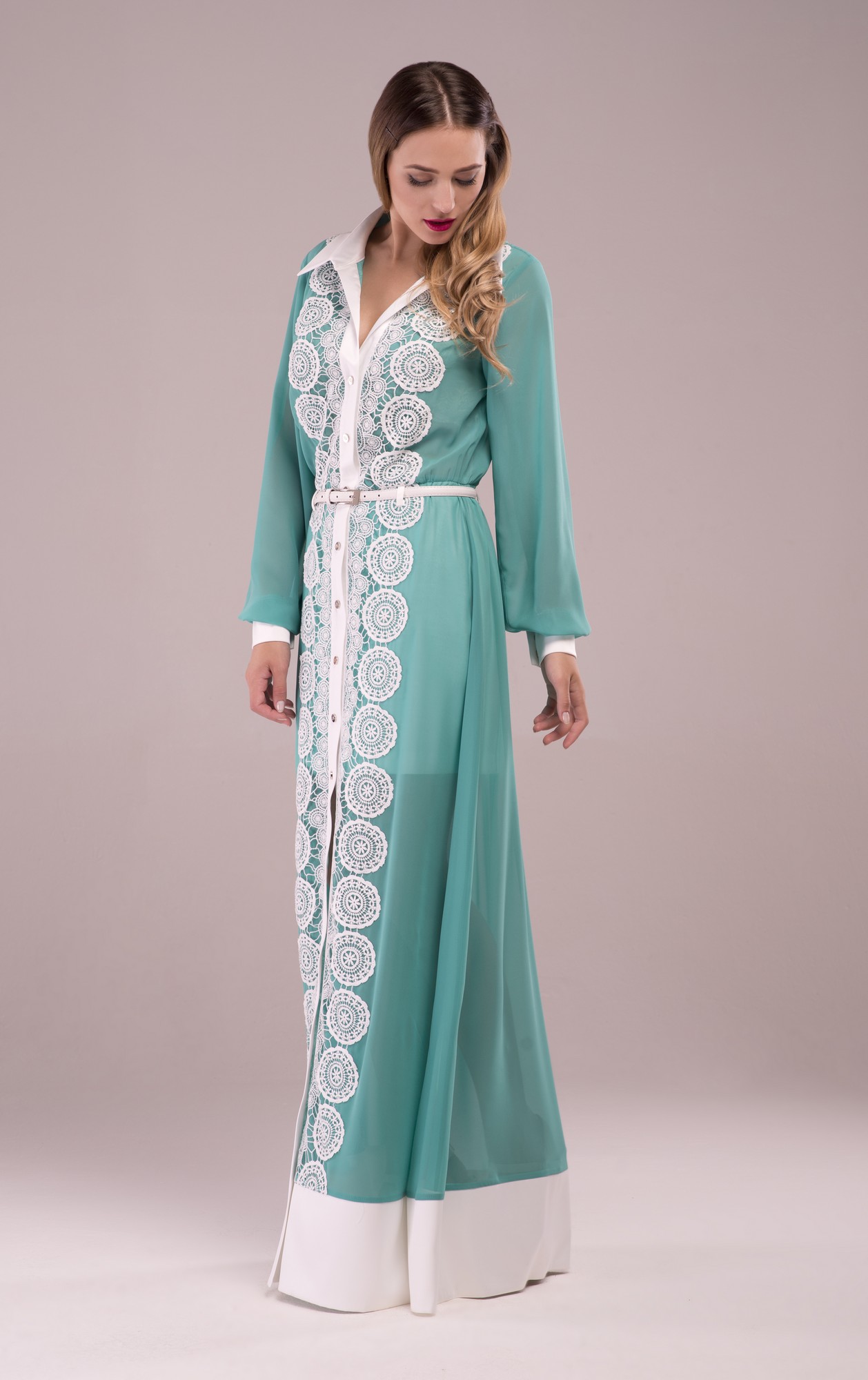 Полуприлегающего силуэта, отрезное по линии талии, нашитым кружевом по центру переда, воротником и длинным рукавом с манжетом, планкой под застёжку на металлических кнопках.