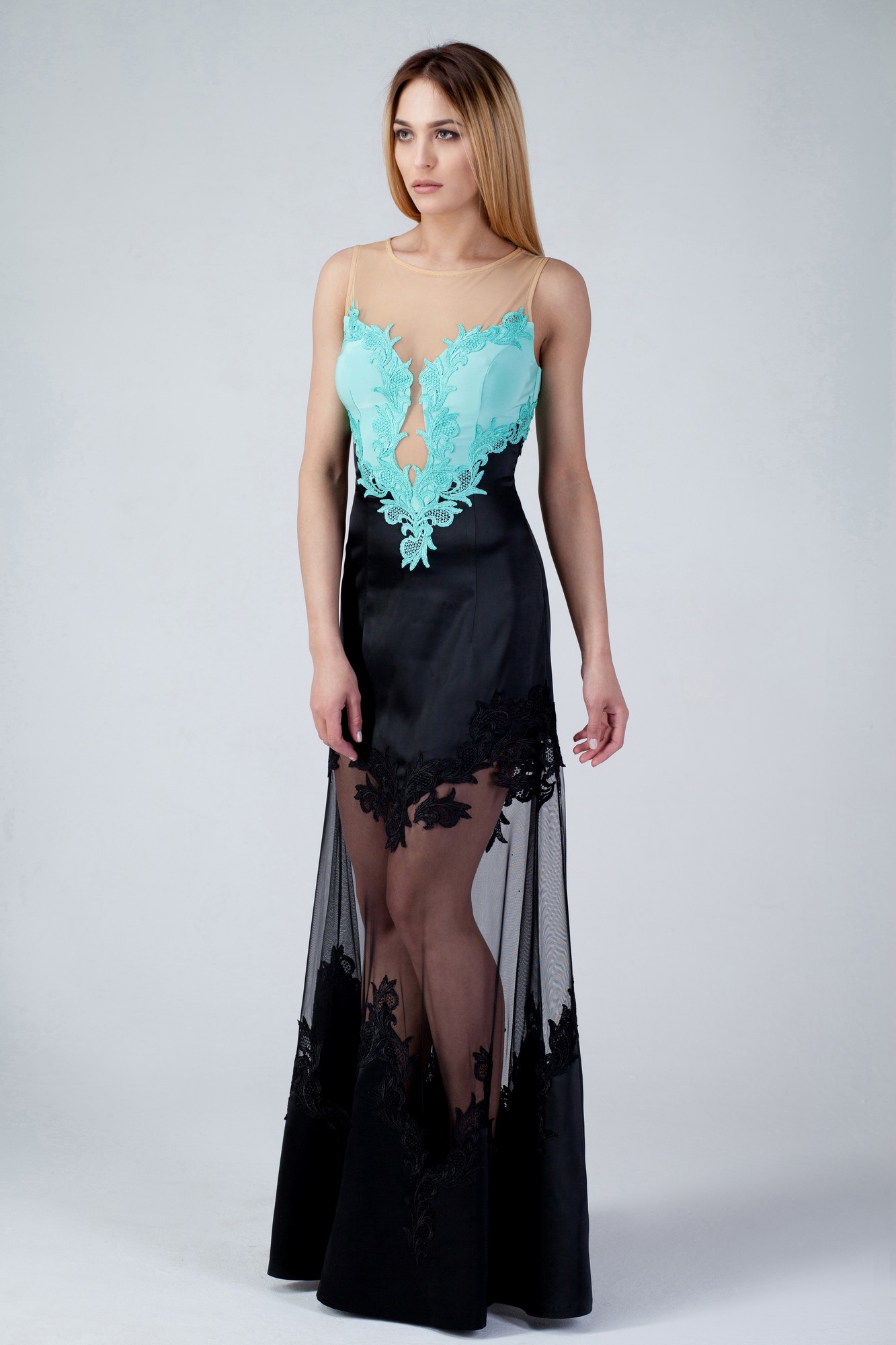 Вечернее платье в пол из 3-х видов комбинированных материалов - сетки, атласа и трикотажа - сочетание контрастных цветов и контрастных фактур.