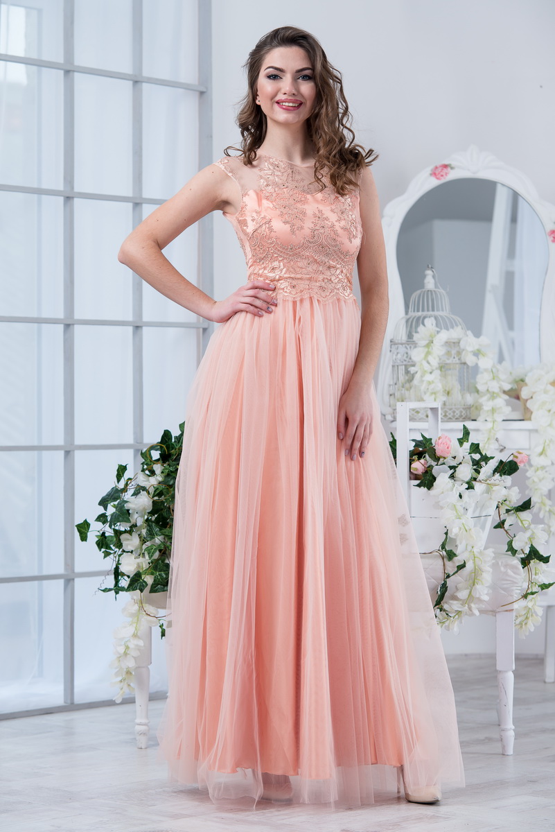 Нарядное пышное платье. Лиф - гипюровый. Прозрачная кокетка выгодно подчеркивает зону декольте. Юбка - расклешенная, из евро-сетки на атласной подкладке. На спинке потайная молния. Длина: 150 см.