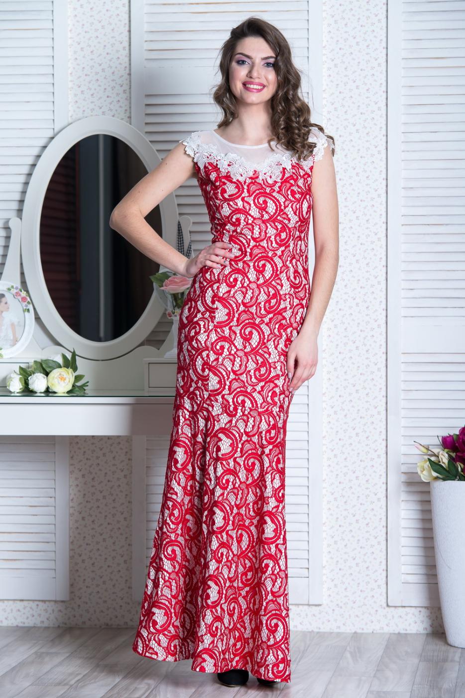 Нарядное платье из гипюра. Кокетка и половина спинки выполнены из прозрачной сетки. Линия соединения украшена кружевом. Рисунок гипюра выгодно подчеркивается подкладкой контрастного цвета. Юбка отрезная, типа годе. Длина: 150 см.