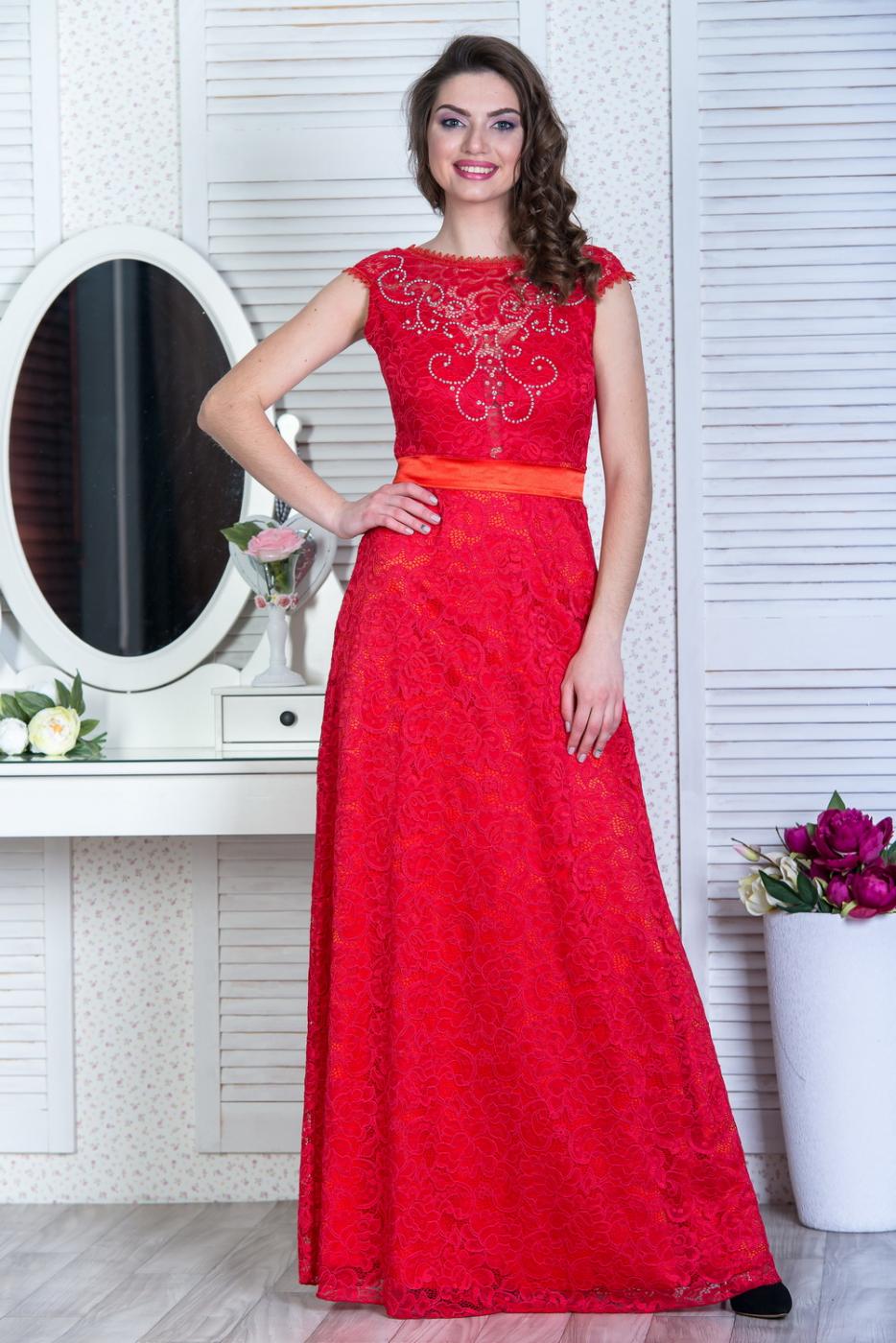 Кружевное платье "в пол". Линия плеч слегка спущена. Глубокое декольте закрыто сверху гипюром "в тон" платью. Вырез горловины обрамлен тоненьким кружевом. На спинке V - образный вырез. Талию подчеркивает атласный пояс, завязывающийся сзади на бант. Длина: 152 см.