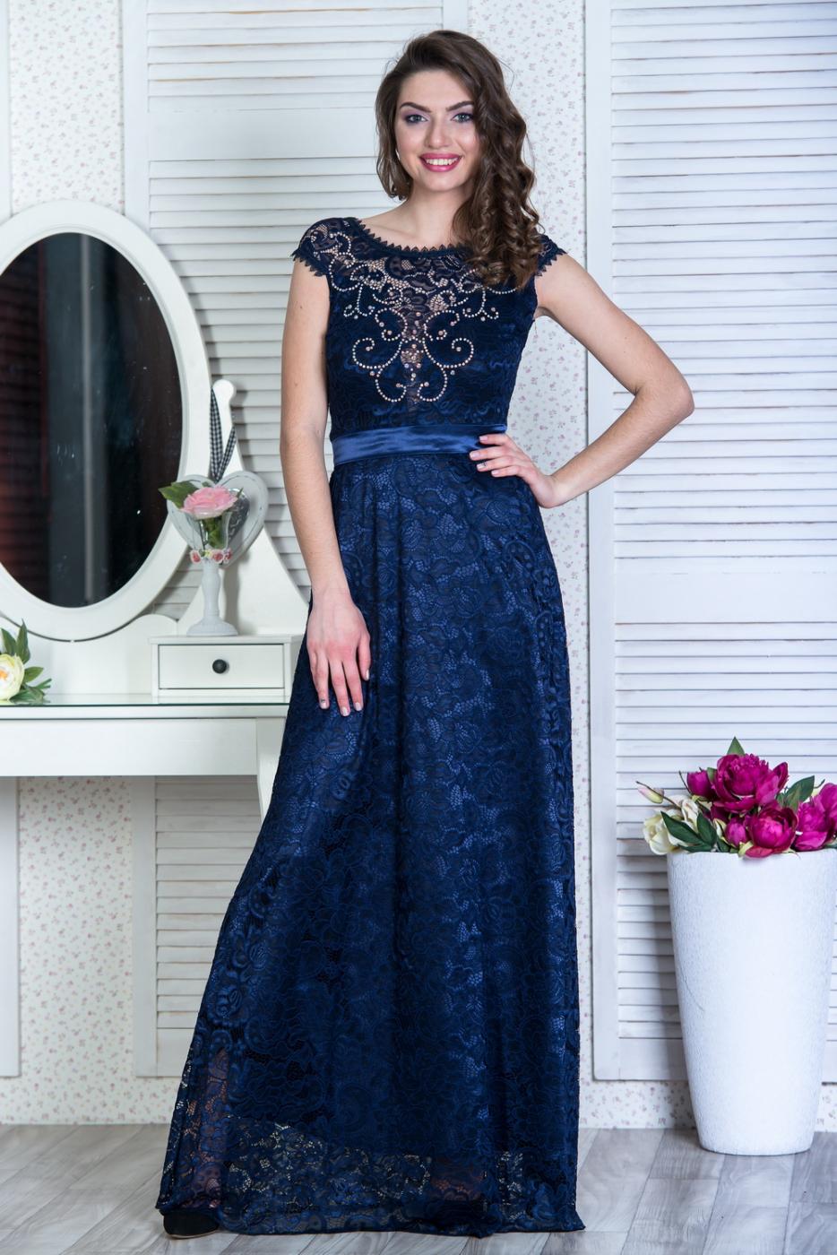 Кружевное платье "в пол". Линия плеч слегка спущена. Глубокое декольте закрыто сверху гипюром "в тон" платью. Вырез горловины обрамлен тоненьким кружевом. На спинке V - образный вырез. Талию подчеркивает атласный пояс, завязывающийся сзади на бант. Длина: 152 см.