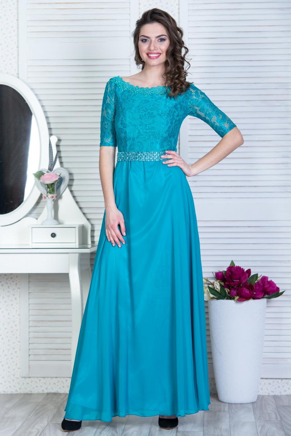 Нарядное платье с широкой шифоновой юбкой на атласной подкладке. Верх выполнен из гипюра, вырез горловины - лодочка и декорирован кружевом. По центру спинки - потаяная молния. Талию подчеркивает пояс "в тон" платья. Длина: 150 см.