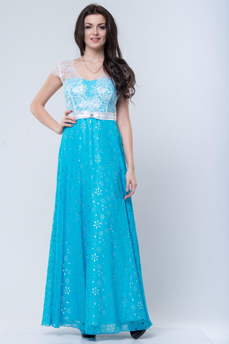 Длинное платье с юбкой из перфорированного шифона. На спине вырез с ажурными боками. Застежка молния заканчивается ниже линии талии. Талию подчеркивает пояс с кокетливым бантиком.