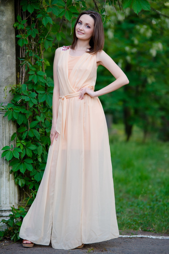 Лёгкое шифоновое платье в греческом стиле. Спереди на плечах оригинальная фурнитура. Спереди на выпуск скрещиваются две волны драпировок. Юбка из кристалла короткая, обтягивающая. Сверху шифоновая юбка с разрезами спереди и сзади, и по бокам. Так же есть шифоновый пояс.