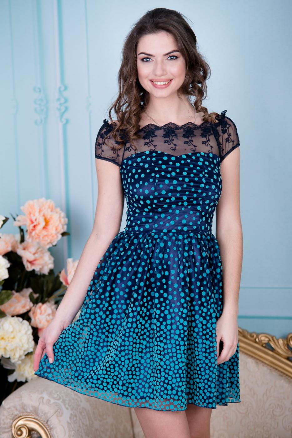 Нарядное короткое платье из атласа. Юбку и лиф украшает сетка с набивным рисунком в горох. На спине вырез-капелька с пуговичкой. Гипюровая кокетка выгодно подчеркивает линию плеч. Талию украшает пояс.
