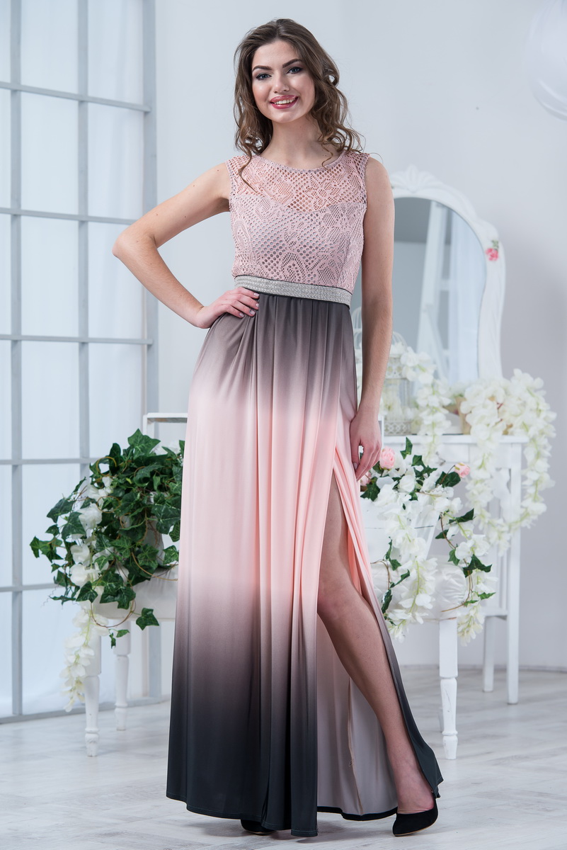 Элегантное вечернее платье. Лиф платья выполнен из гипюра макраме на подкладке. Спинка полупрозрачная. Юбка на запах из кристалла окраски градиент. Пояс расшит камнями.