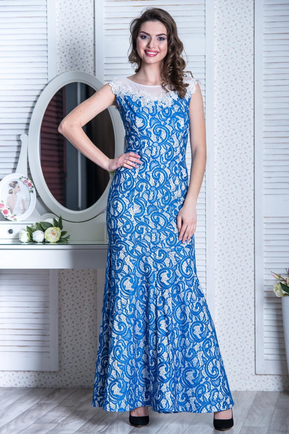 Нарядное платье из гипюра. Кокетка и половина спинки выполнены из прозрачной сетки. Линия соединения украшена кружевом. Рисунок гипюра выгодно подчеркивается подкладкой контрастного цвета. Юбка отрезная, типа годе. Длина: 150 см.