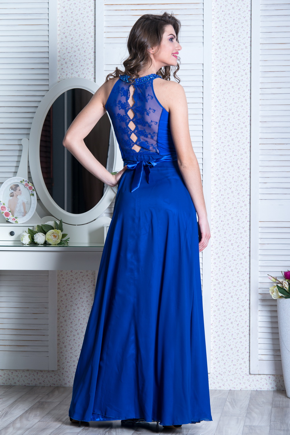 Нарядное вечернее платье. Юбка шифоновая длиной "в пол", на атласной подкладке. Лиф выполнен из кристалла и украшен гипюром. Спинка - гипюровая, разделена на отдельные половинки, соединенные между собой кружевными краями. Талия и линия горловины декорированы украшением из камней. Длина: 145 см.