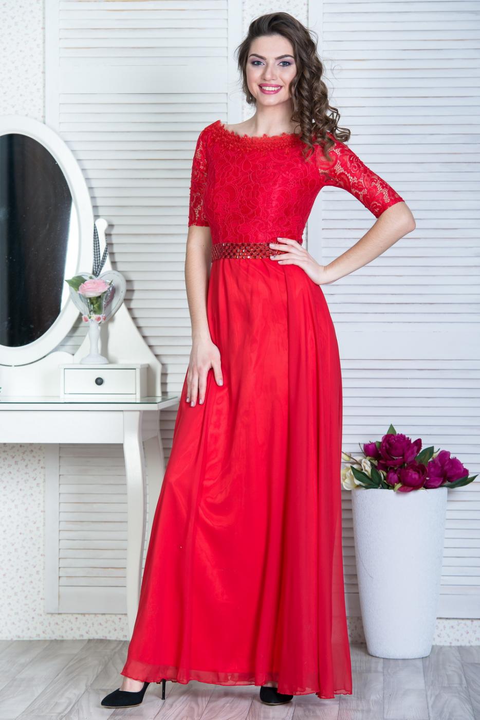 Нарядное платье с широкой шифоновой юбкой на атласной подкладке. Верх выполнен из гипюра, вырез горловины - лодочка и декорирован кружевом. По центру спинки - потаяная молния. Талию подчеркивает пояс "в тон" платья. Длина: 150 см.