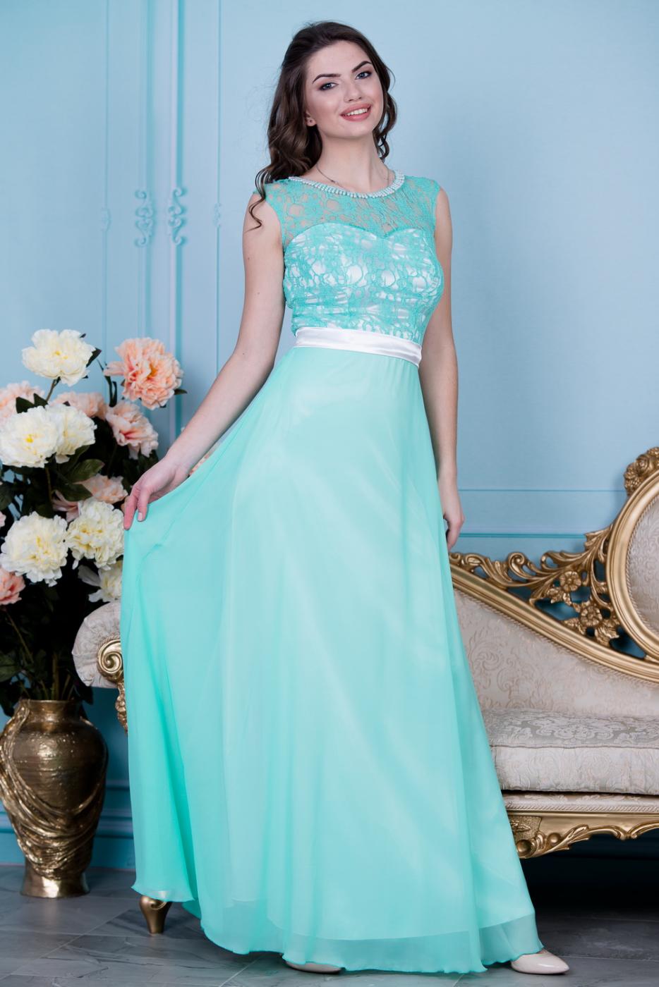 Платье с рашклешенной шифоновой юбкой. Верх платья выполнен из гипюра. Спинка полуоткрыта. Линию талии подчеркивает пояс контрастного цвета.