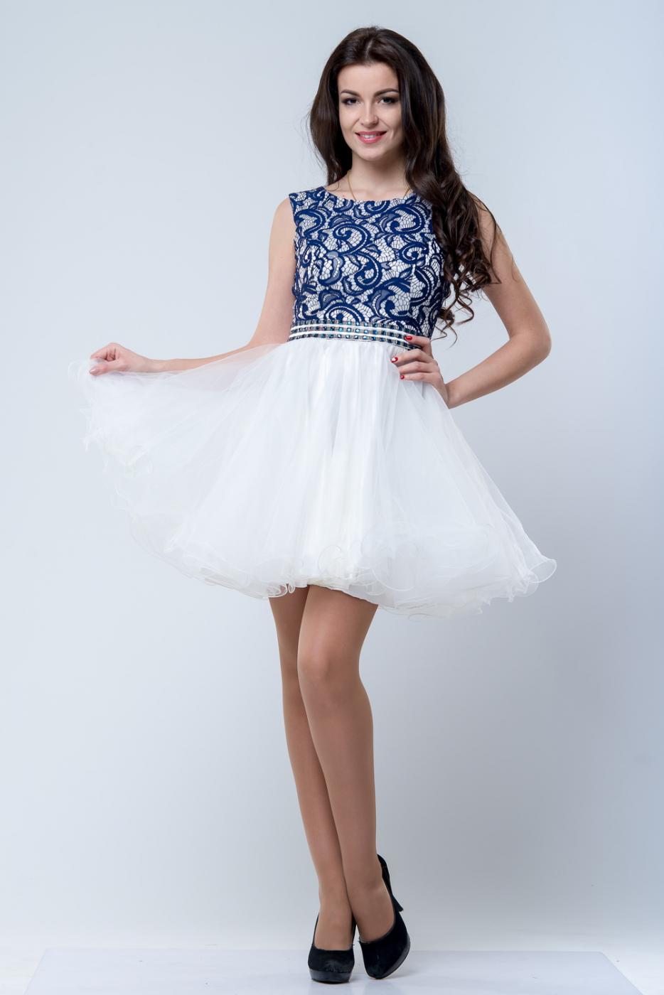 Короткое платье с пышной юбкой. Контрастные верх и низ платья делают образ женственным. Пышная юбка придает образу воздушности. Пояс расшит камнями.