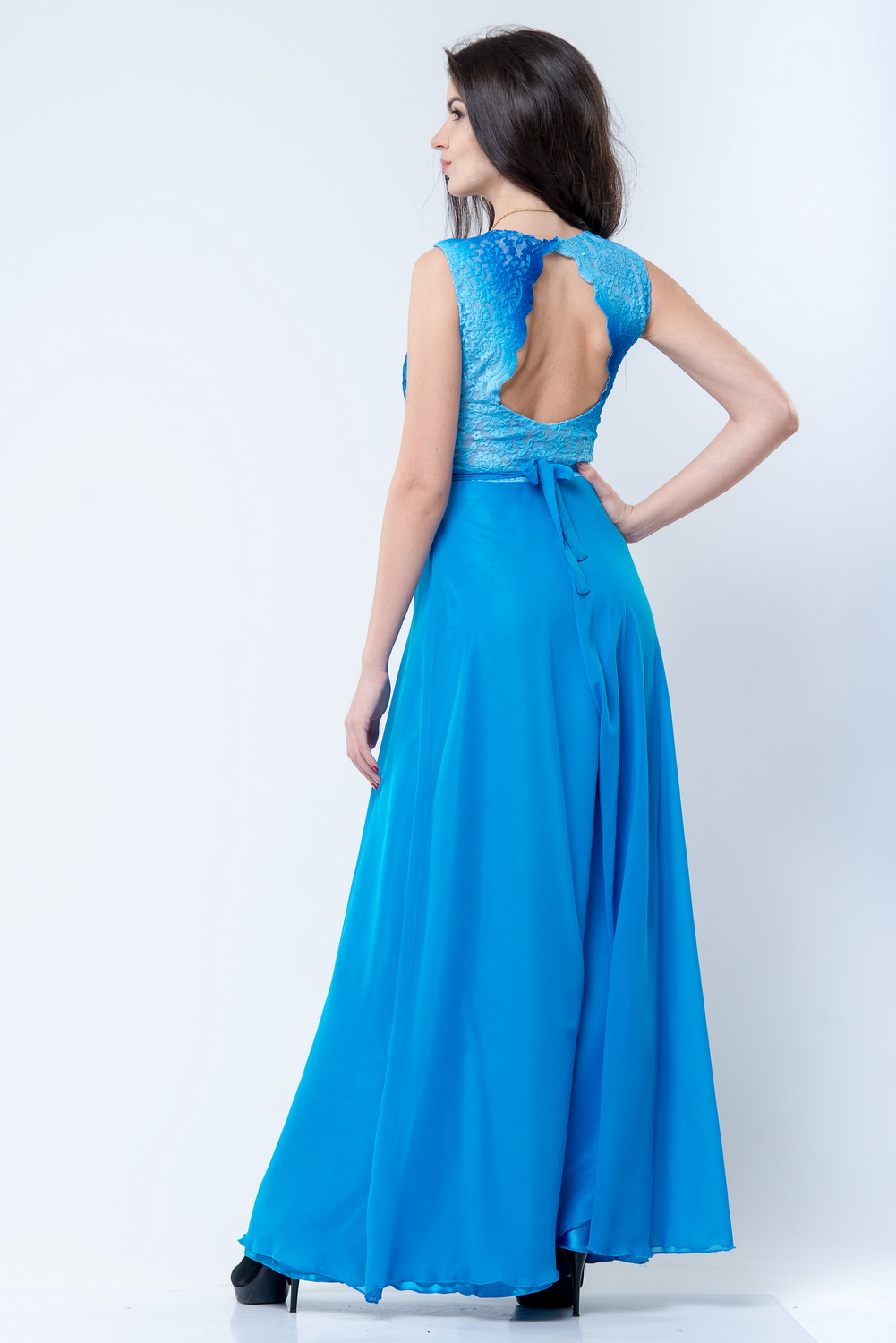 Нарядное длинное платье. Верх платья из гипюра и расшит камнями. Юбка - шифоновая с атласной подкладкой. Спинку украшает треугольный вырез обрамленный ажурными краями. Пояс декорирован кристаллами и завязывается сзади на бант. Длина 145 см.