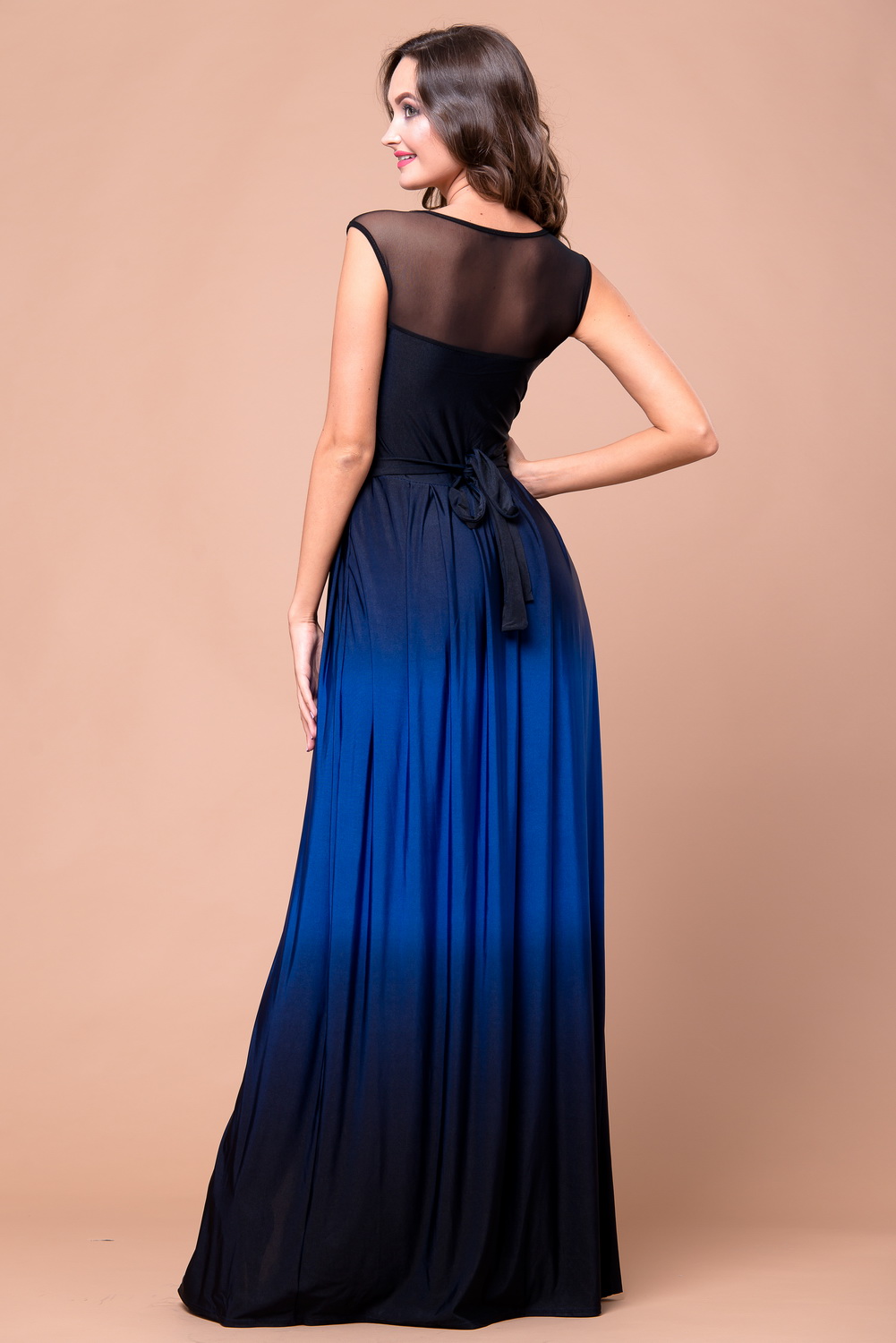 Вечернее длинное платье из кристалла. Гипюровый верх, полупрозрачная кокетка и половина спинки, градиент на юбке и высокий разрез "на запах" - все это придает образу загадочности и сексуальности. Пояс декорирован камнями и завязывается сзади на бант.