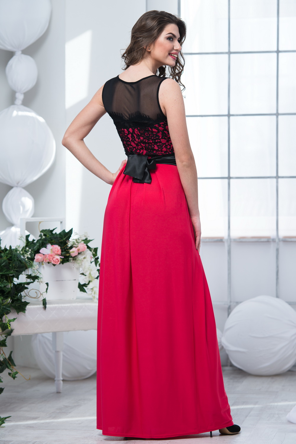Длинное вечернее платье в пол. Лиф платья из плотного темного кружева, которое накладывается на яркую подкладку. Кокетка спинки и полочки из сетки, в цвет кристалла. Спереди по всей длине юбки разрез, который идёт внахлёст одним полотном. Линия талии подчеркнута атласным декорированным поясом.