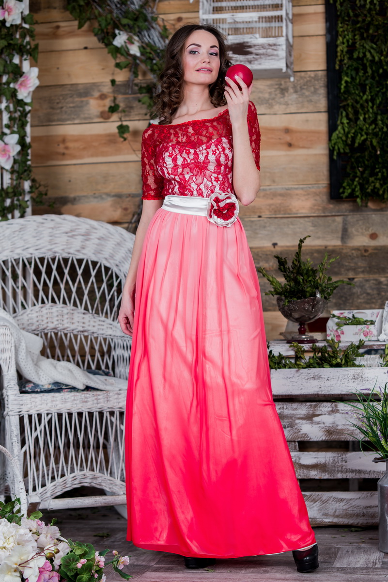 Изящное женственное платье с шифоновой градиентной юбкой. Верх платья выполнен из яркого малострейчевого гипюра. Вырез горловины формой "лодочка" открывает плечи и делает шею длиннее. Рукава, кокетка полочки и спинки полупрозрачные, а сам лиф имеет атласную подкладку, также как и юбка. Линия пояса подчеркнута атласным поясом, который украшает большая пышная роза из атласа и гипюра.Вырез горловины, а также низ рукава обработан ажурной тесьмой.Длина: 150 см.