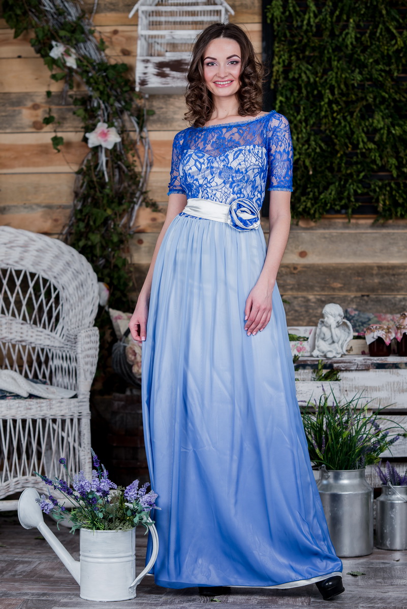 Изящное женственное платье с шифоновой градиентной юбкой. Верх платья выполнен из яркого малострейчевого гипюра. Вырез горловины формой "лодочка" открывает плечи и делает шею длиннее. Рукава, кокетка полочки и спинки полупрозрачные, а сам лиф имеет атласную подкладку, также как и юбка. Линия пояса подчеркнута атласным поясом, который украшает большая пышная роза из атласа и гипюра.Вырез горловины, а также низ рукава обработан ажурной тесьмой.Длина: 150 см.